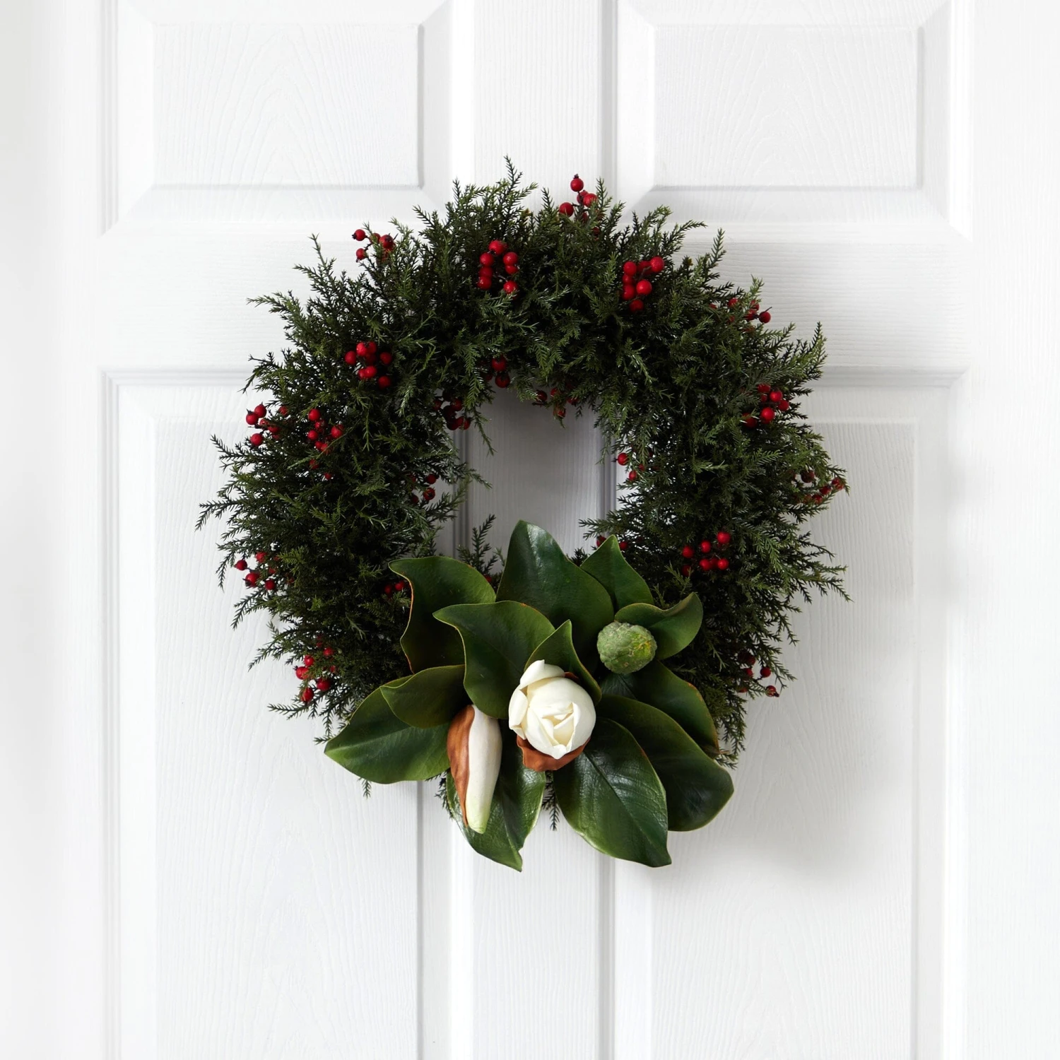 20” Cedar, Berries And Magnolia Artificial Christmas Wreath