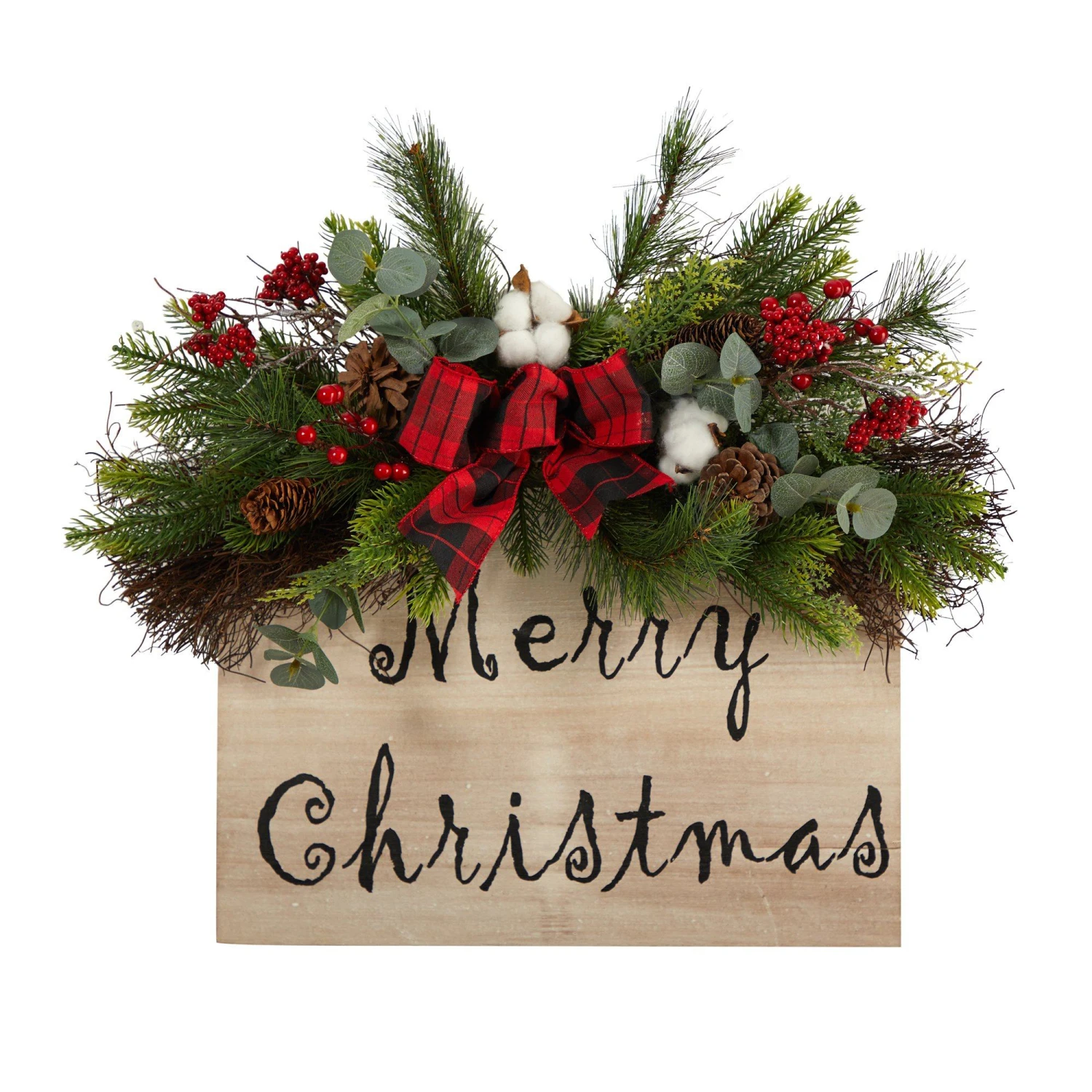 We wish you a Merry Christmas. Spread holiday cheer with this rustic-inspired hanging wall décor. The evergreens are accented by pinecones and Christmas bows, adding a little color. Easily hang in a bare wall that needs a festive touch. With dimensions of 24″ X 20″, add a holiday touch to any space. Makes a fine gift to a friend.