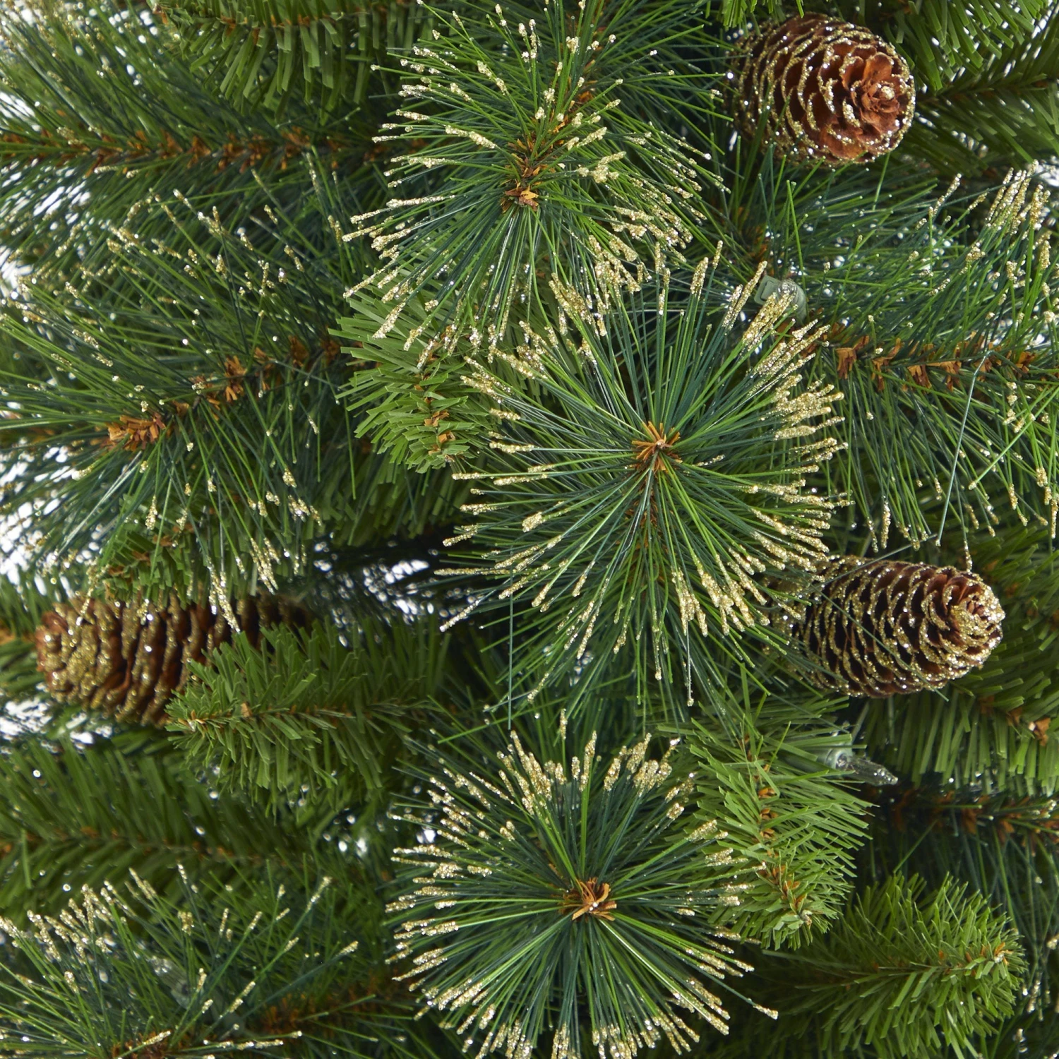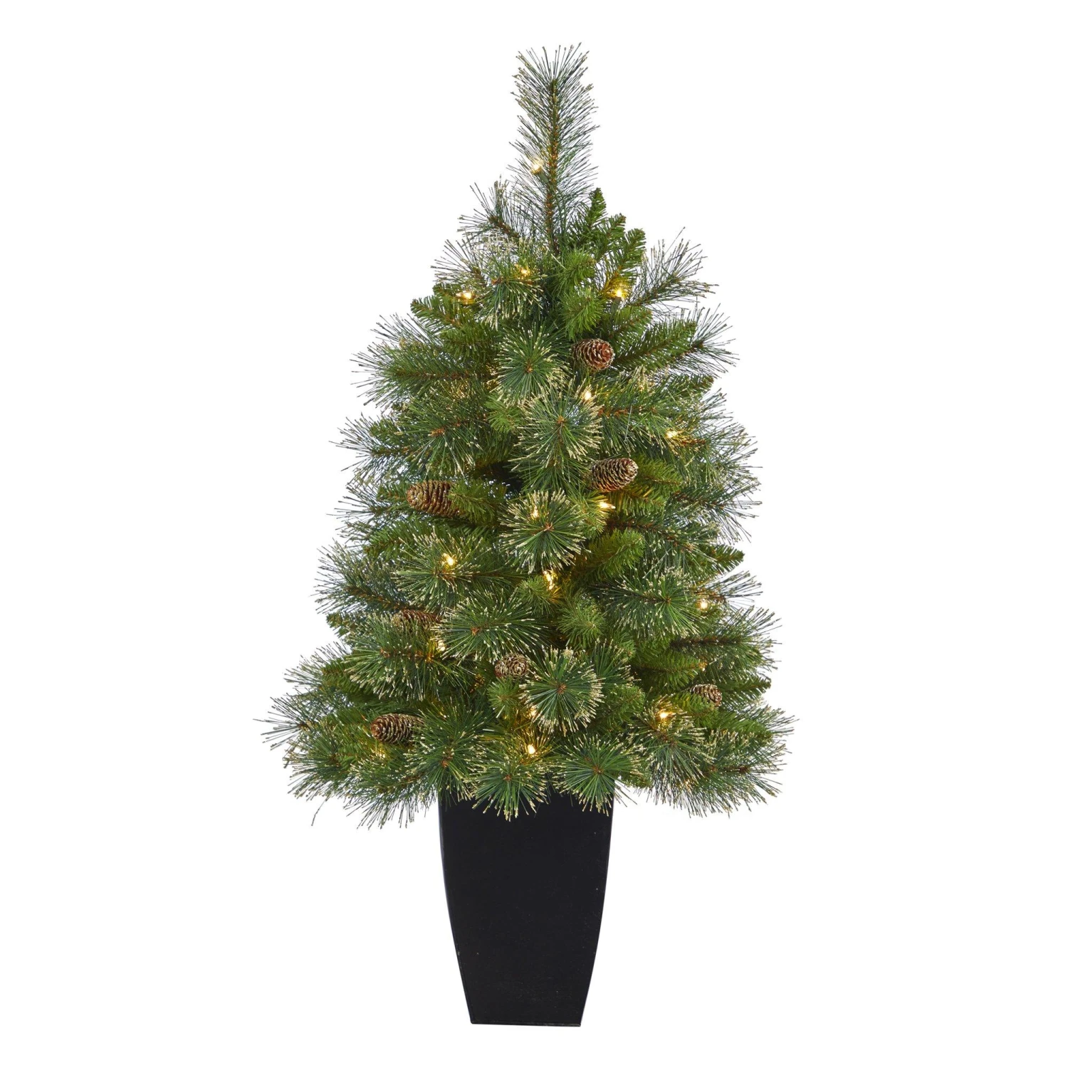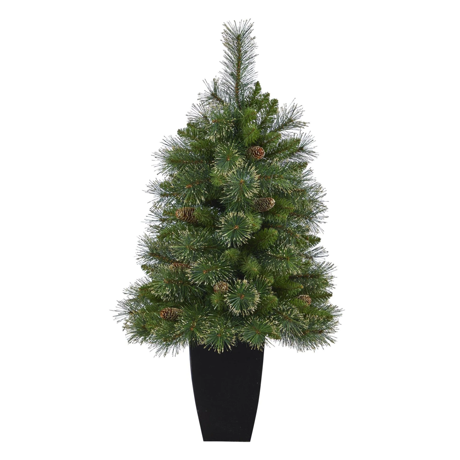 Create your own mini winter wonderland with the help of this Golden Tip Washington Pine Artificial Christmas Tree. Featuring variegated tips and faux pinecones for a natural look inspired by the Pacific Northwest’s rugged beauty. Incredibly lifelike, 148 easy-to-bend branches mimic the outdoors – allowing you to shape and display your holiday ornaments. To help save you time and money. This artificial Christmas tree comes pre-lit with 50 clear lights for a warm, holiday glow. Standing 3.5′ from a black metal planter display in compact spaces that need some extra holiday cheer. Can also decorate them in multiples.