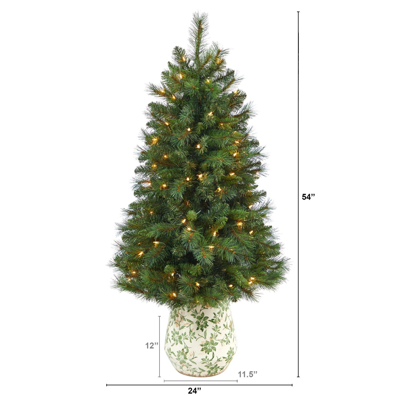 4.5’ West Virginia Mountain Pine Artificial Christmas Tree With 100 Clear Lights And 322 Bendable Branches In Floral Print Planter
