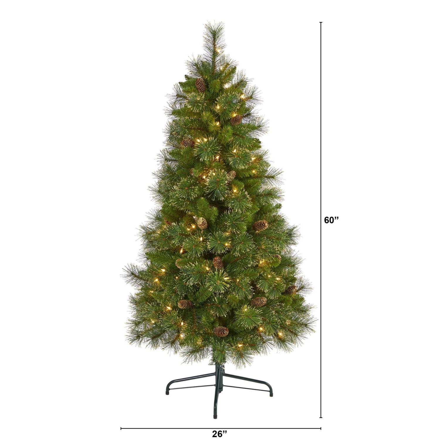 Spread seasonal cheer by creating your very own traditional Christmas with the help of this artificial Christmas tree. Completely maintenance-free, this realistic looking artificial Christmas tree boasts a full and robust silhouette made up of easy-to-bend branch tips for showcasing all your favorite holiday ornaments, handsomely accented throughout with faux pinecones. Arriving pre-strung with 150 clear LED lights to eliminate tangles and carefully stabilized on a metal stand, this versatile 5’ tall artificial Christmas tree will not only make holiday decorating a breeze but ensure your home is always holiday-dressed for years to come.