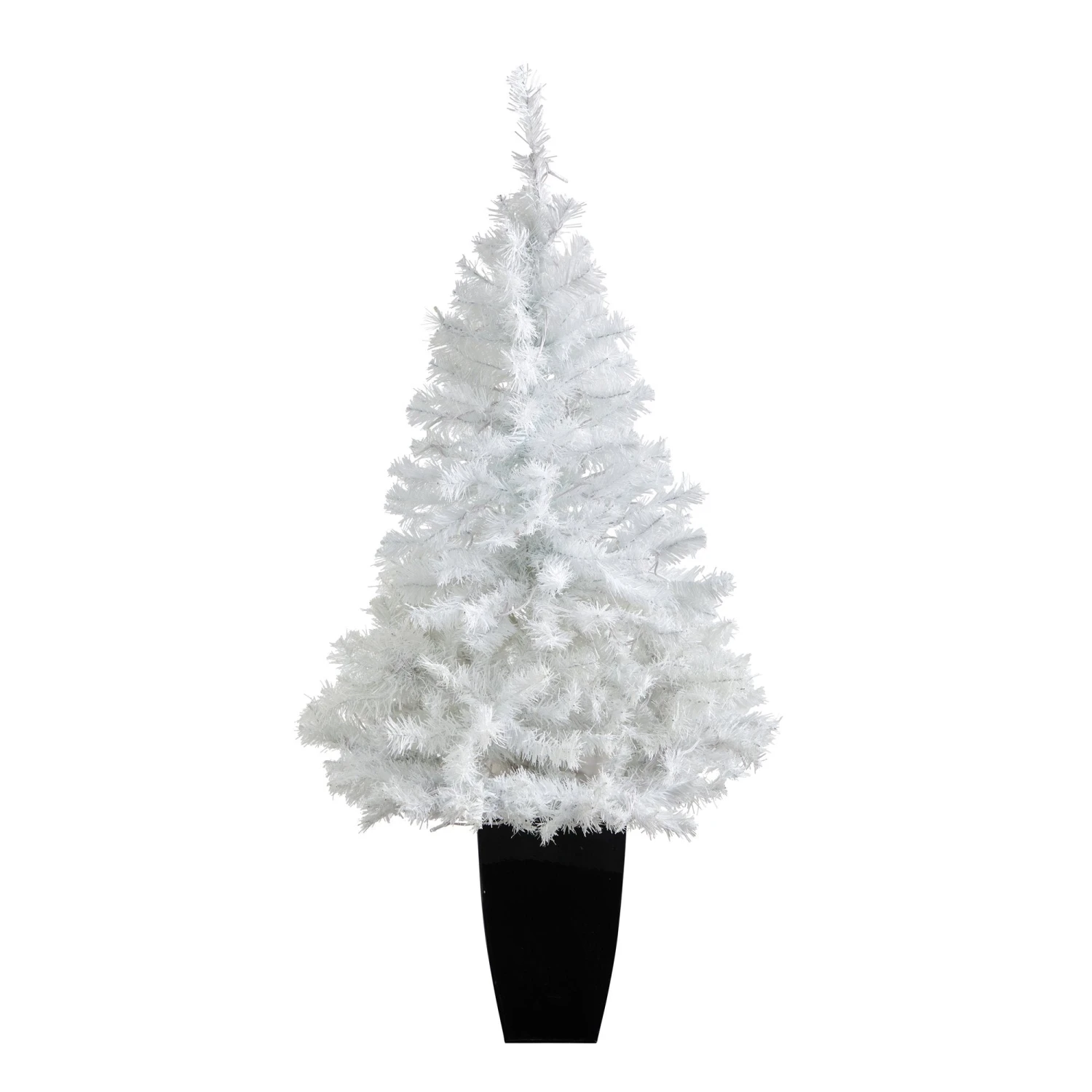 Dreaming of a white Christmas? Feel nostalgic with this small White Artificial Christmas Tree just like the ones you used to know. Rock around incredibly lifelike textured branches that can house a symphony of ornaments and accents. To help save you time and money, this Xmas tree comes pre-lit with 100 clear LED lights for a warm, holiday glow. Standing 50″ from a black metal planter (included in height) make a holiday statement in any compact space. Curate in apartments, lonely corners, offices. For an updated look, pair in multiples with other artificial Christmas trees.