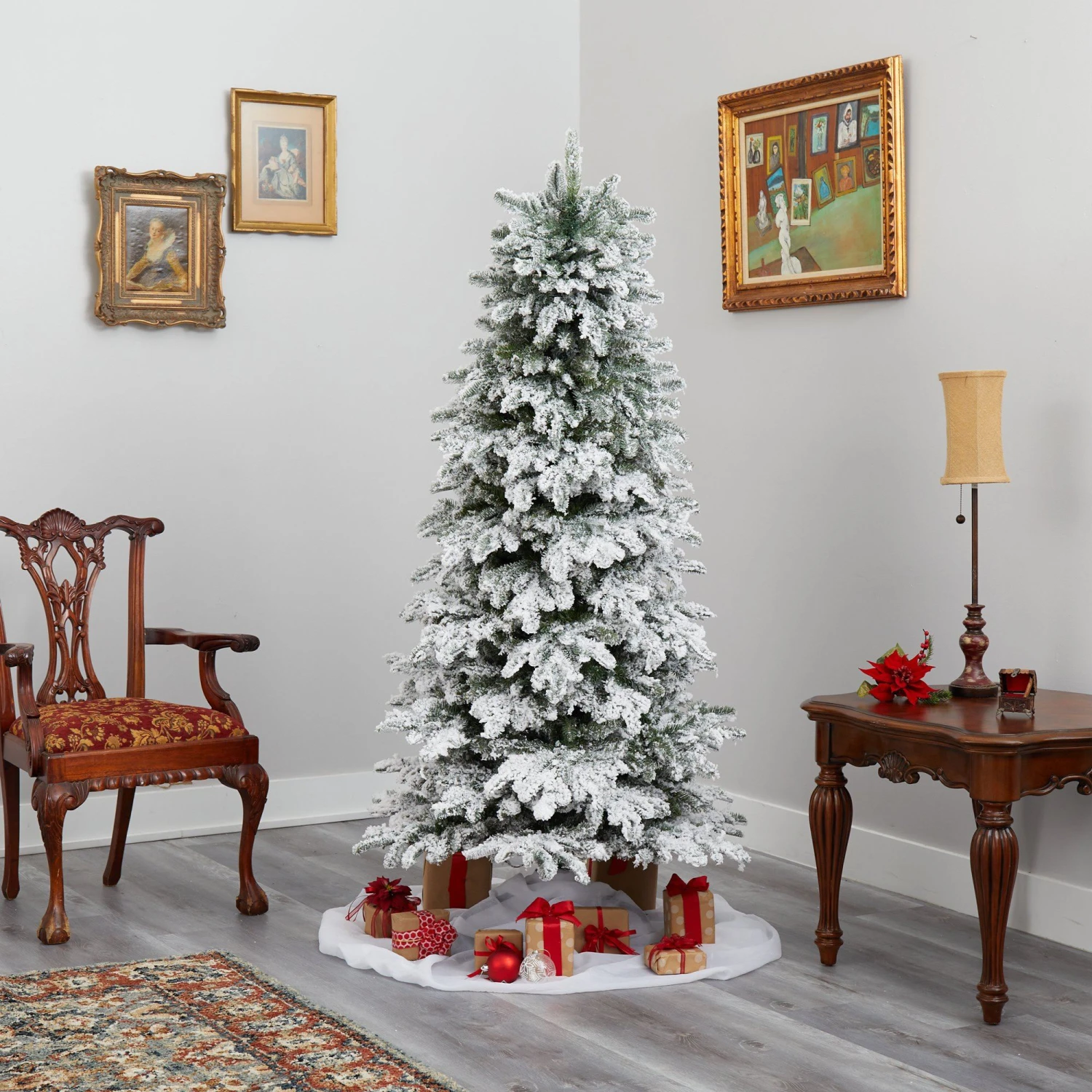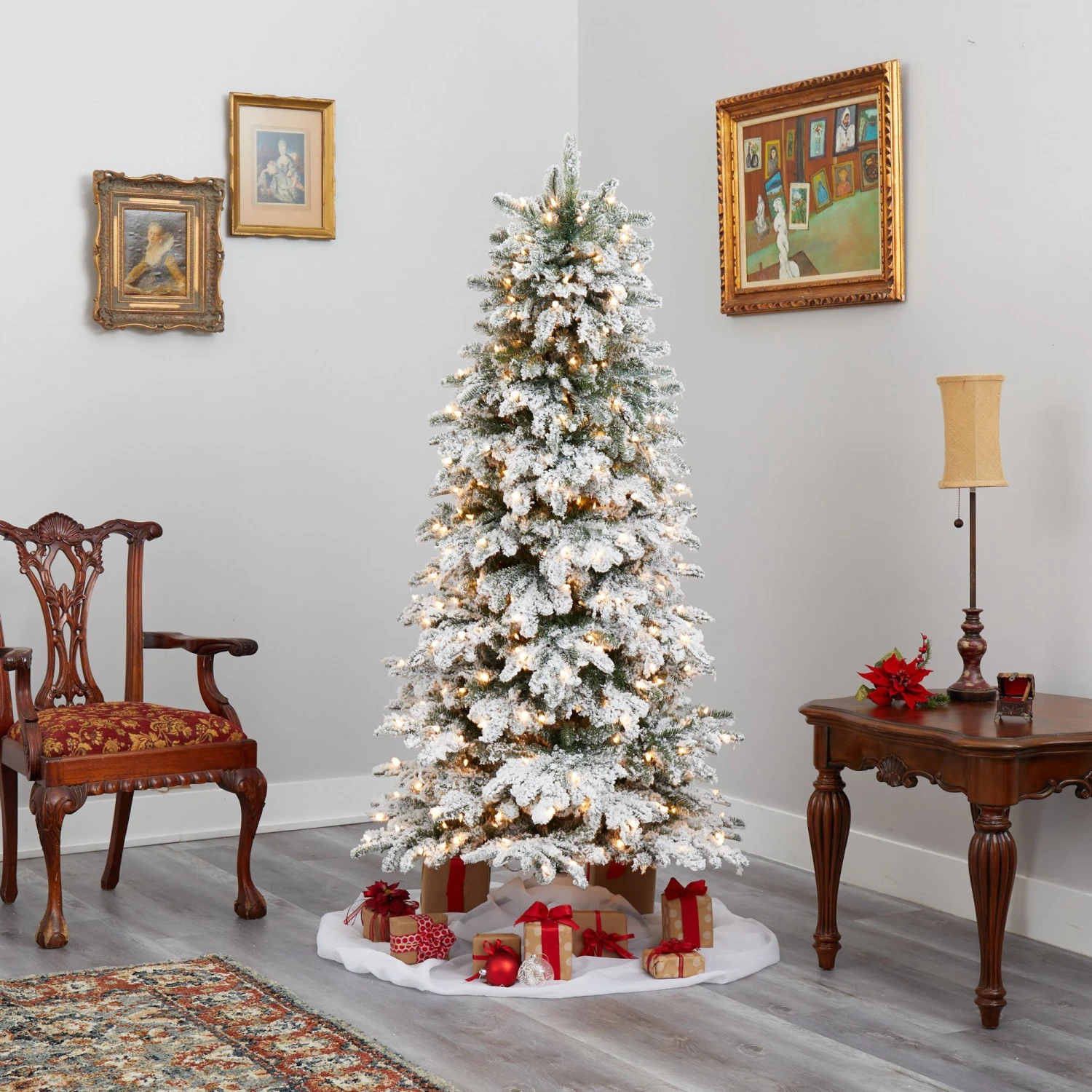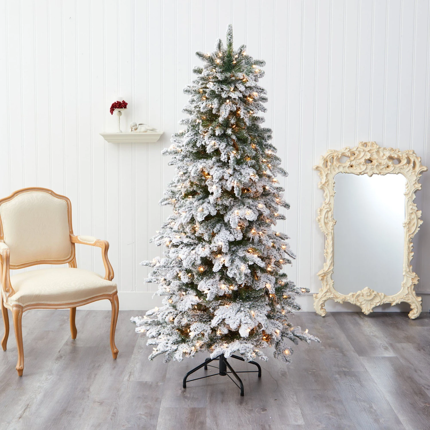 Create a winter-inspired Christmas scene without the hassle of upkeep or maintenance with the help of this flocked artificial Christmas tree. Perfect for tight, narrow spaces because of its slim silhouette, it boasts evergreen foliage made up of 1560 easy-to-bend branch tips for showcasing your favorite holiday ornaments- all fully flocked with faux snow to create a winteresque Christmas. Arriving pre-strung with 450 clear LED lights to eliminate tangles and carefully stabilized on a metal stand, this flocked 6’ tall artificial Christmas tree will not only make decorating a breeze but ensure your home is holiday-ready for years to come.
