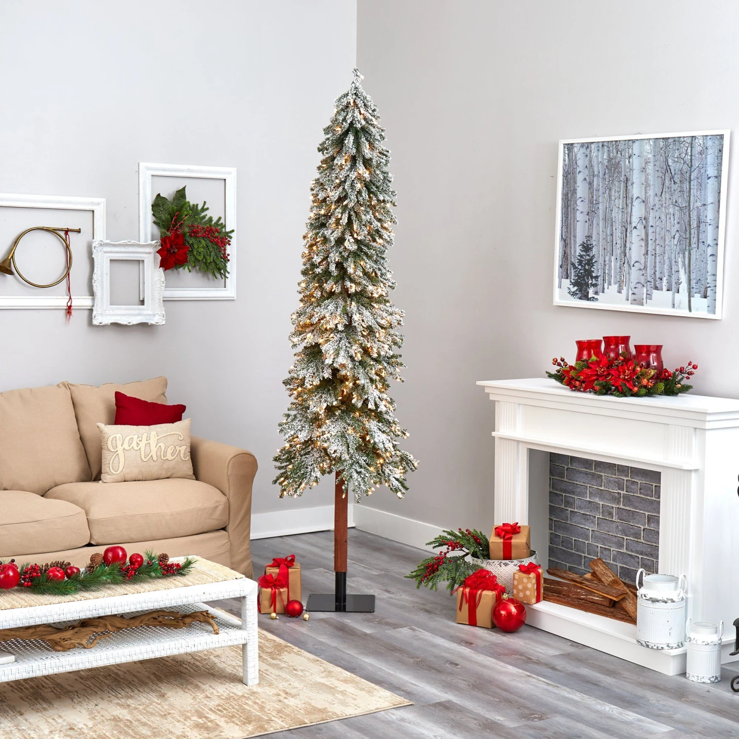Set up a winter-inspired Christmas scene even in a limited space environment with the help of this flocked artificial Christmas tree. Easy and effortless, this winter-inspired artificial Christmas tree boasts a slim and slender silhouette made up of 1051 easy-to-bend branches to showcase all your favorite holiday ornaments and beautifully flocked in a winter coating of faux snow to evoke the impression of freshly fallen snow. Arriving pre-strung with 500 clear LED lights to eliminate unsightly tangles and carefully stabilized on an extended faux wooden pole and metal stand, this snowy 8’ artificial Christmas tree will undoubtedly transform your holiday decor, year after year.