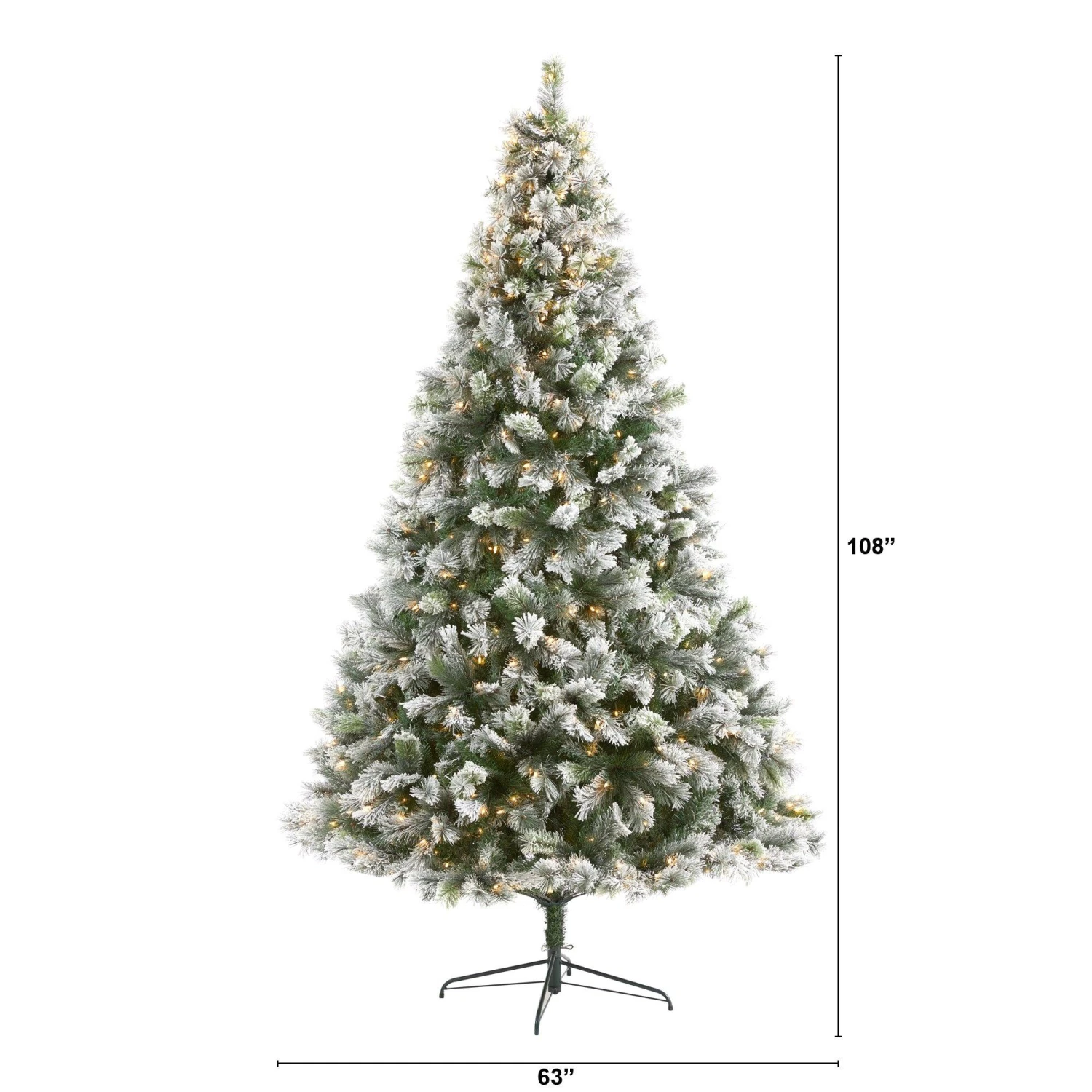 9’ Flocked Oregon Pine Artificial Christmas Tree With 600 Clear Lights And 1580 Bendable Branches